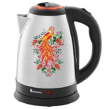 Объем 1,8 л. Максимальная мощность 2000 Вт. Закрытый нагревательный элемент из нержавеющей стали. Корпус из высококачественной нержавеющей стали с декором. Декор: Жар-птица. Матовая полировка. Вращение корпуса на 360°. Световой индикатор работы. Внутренняя шкала уровня воды. Отсек для хранения электрошнура. Цвет крышки и ручки: черный. Цвет вставки: коралловый. Многоуровневая защита: автоматическое отключение при закипании, отключение при снятии чайника с базы, отключение при недостаточном количестве воды.