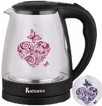 Объем 1,8 л, Номинальная потребляемая мощность 2000 Вт, Корпус из высококачественного жаропрочного стекла, Закрытый нагревательный элемент из нержавеющей стали, Вращение корпуса на 360°, Рисунок-индикатор меняет цвет при нагревании, Внутренняя LED-подсветка разных цветов (6 цветов), Шкала уровня воды, Отсек для хранения электрошнура, Автоматическое отключение при закипании, Блокировка включения без воды.