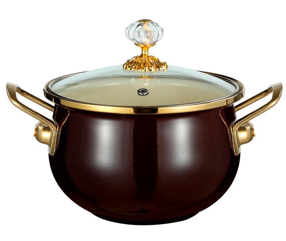 Кастрюля с крышкой 4,0 л (20 см) с внутренним и внешним трехслойным эмалированным покрытием, материал - углеродистая сталь. Ручка на крышке "под кристалл". Ручки на корпусе "под золото". Подходит для индукции. Подарочная упаковка.