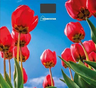 Весы напольные.Рисунок: тюльпаны.Стеклянная поверхность.Размер платформы 26см*26см.Максимальная нагрузка 180 кг.Единица измерения: кг, фунты Питание от батарейки 1*CR2032 (включена).Состав (материал): стекло, металл, пластик.
